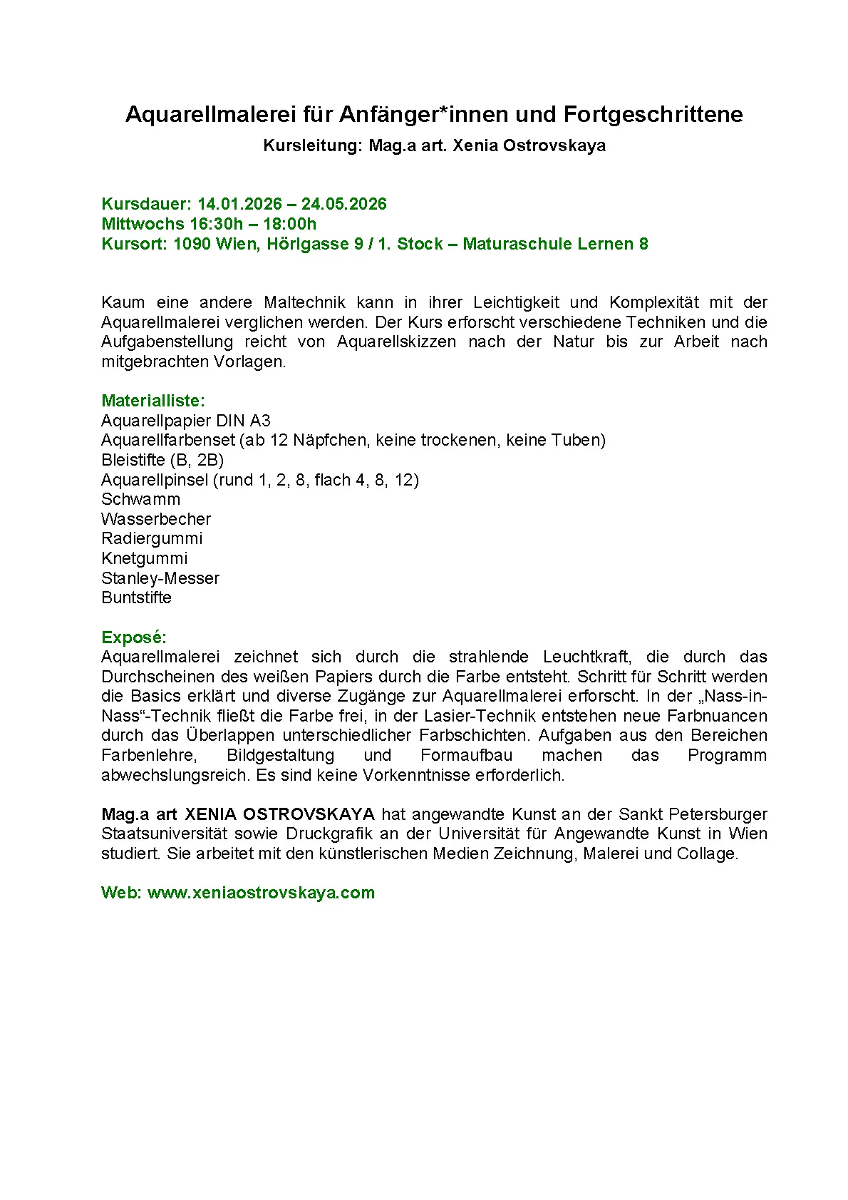 Aquarellmalen für Anfänger und Fortgeschrittene - nächster Beginn voraussichtlich im Wintersemester 2026 Mi. 14.01.-24.05.2026 / 16:30h-18:00h / € 380,- bzw. 6x € 65,-