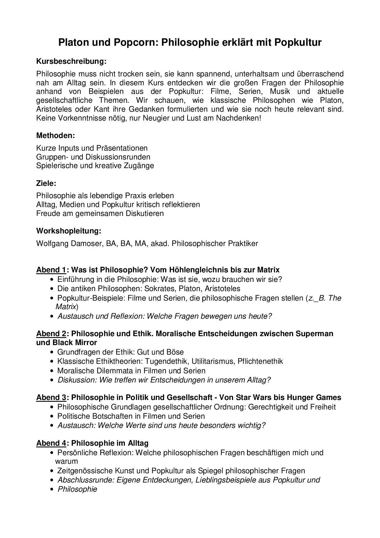 Platon und Popcorn Do. 05.03.-26.03.2026 / 18:00h-19:30h / € 160,-