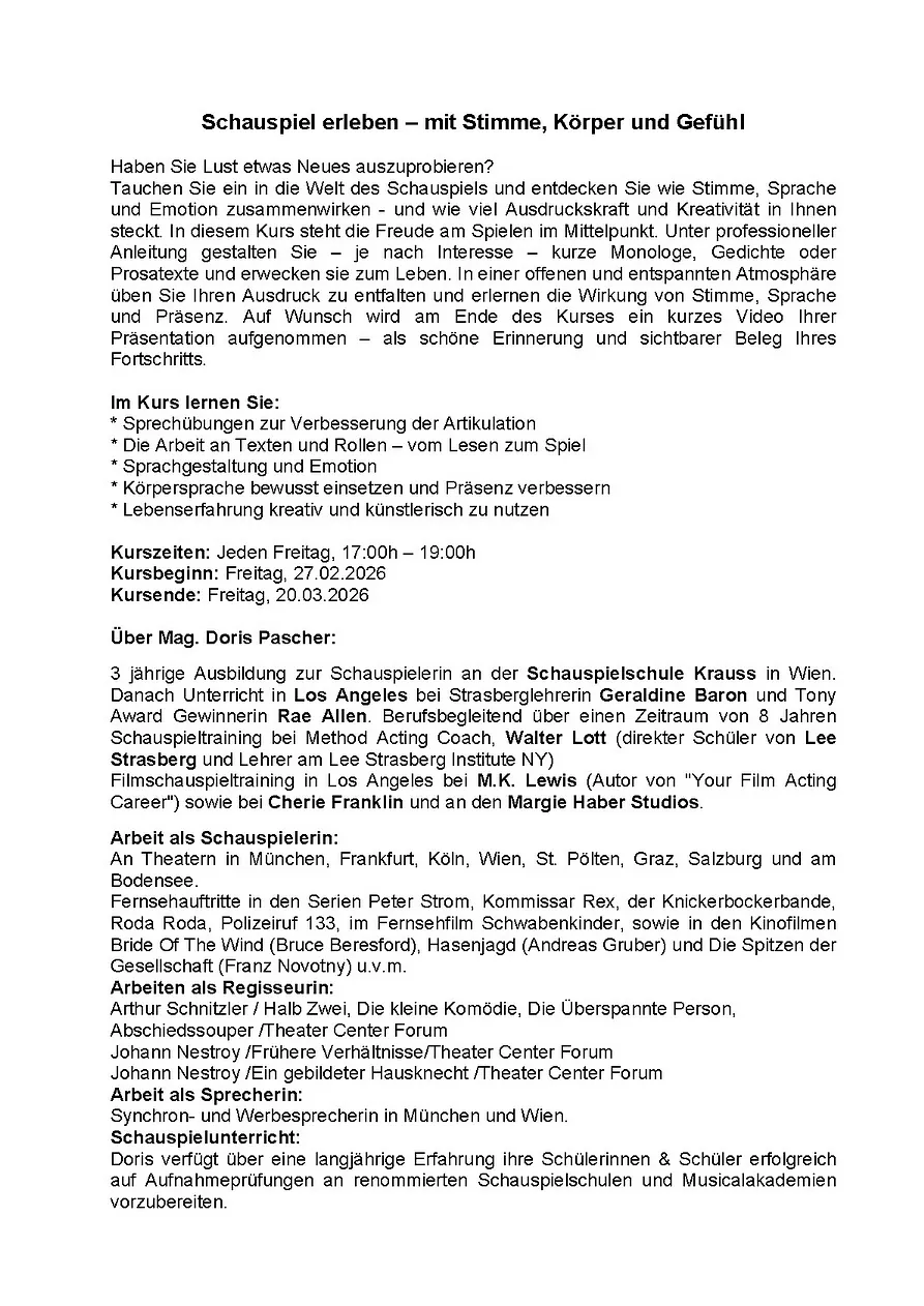 Schauspiel - Vortragskunst für den Alltag Fr. 27.02.-20.03.2026 / 17:00h-19:00h / € 295,- bzw. € 2x € 150,-