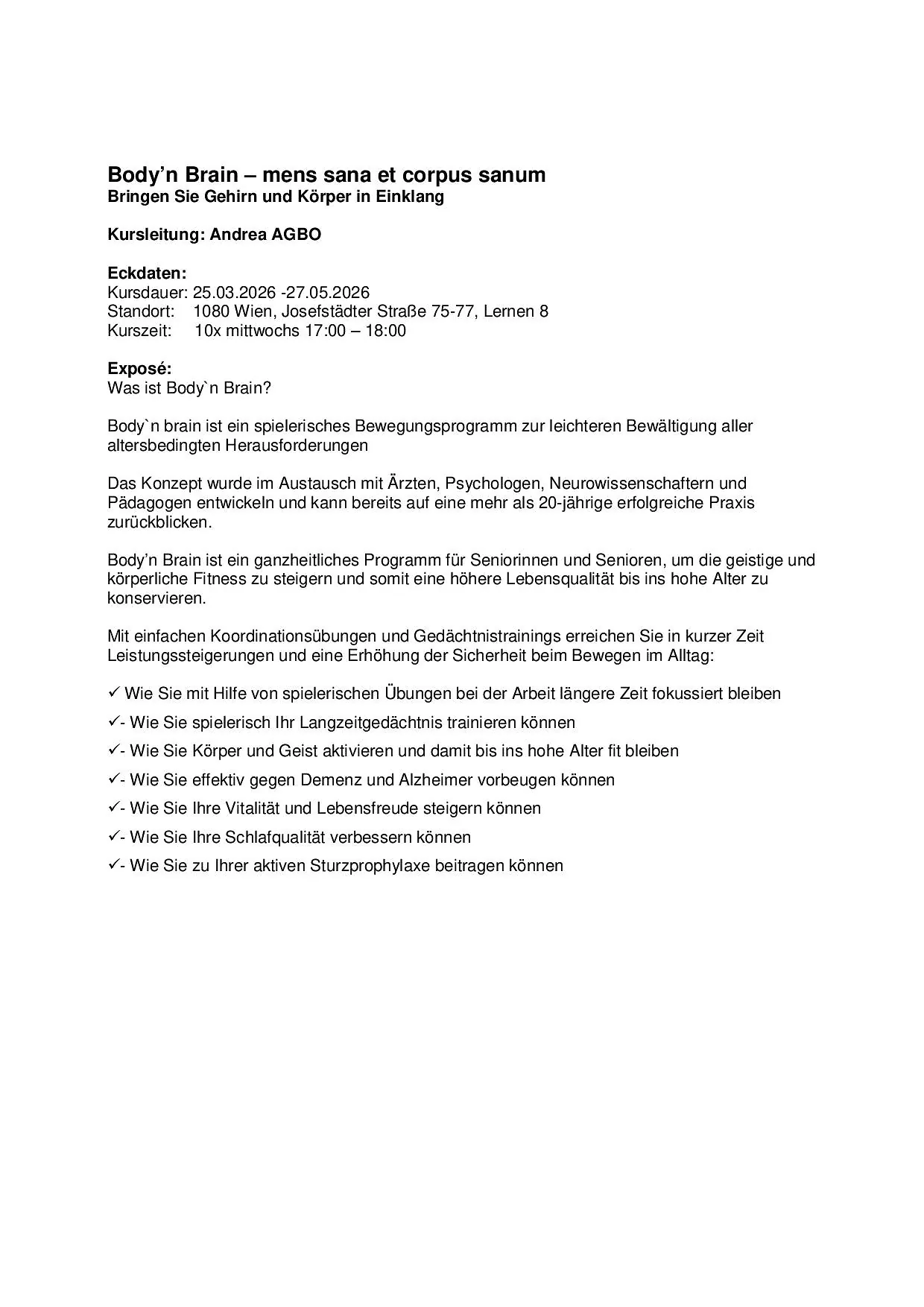 Body'n brain - mens sana et corpus sanum Mi. 25.03.2026 - 27.05.2026 / 17:00h-18:00h / € 165,- bzw. 3x € 57,-