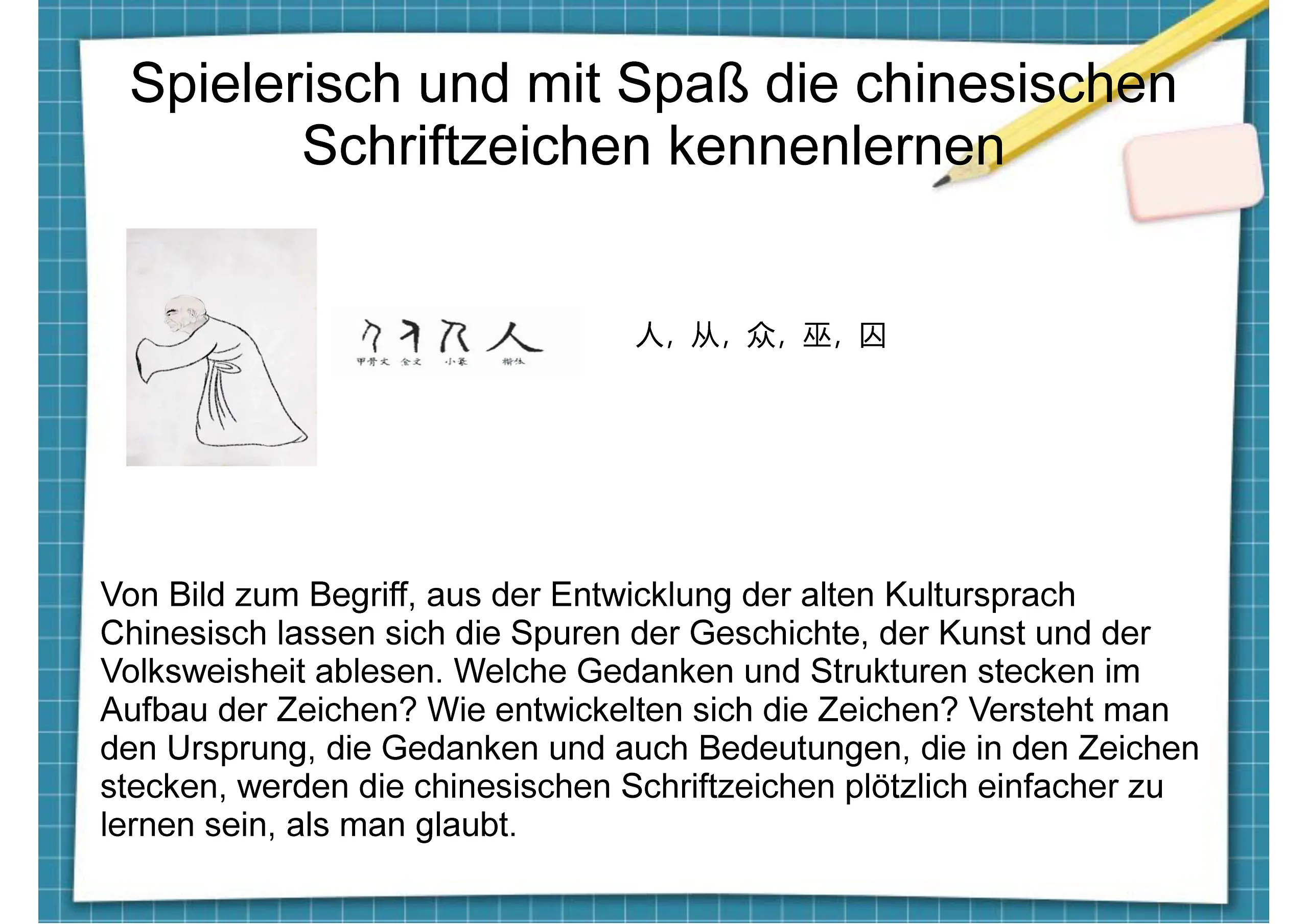 Die Geheimnisse der chinesischen Schriftzeichen Di. 03.02.-07.04.2026 / 10:30h-12:00h / € 290,- bzw. 3x € 99,-