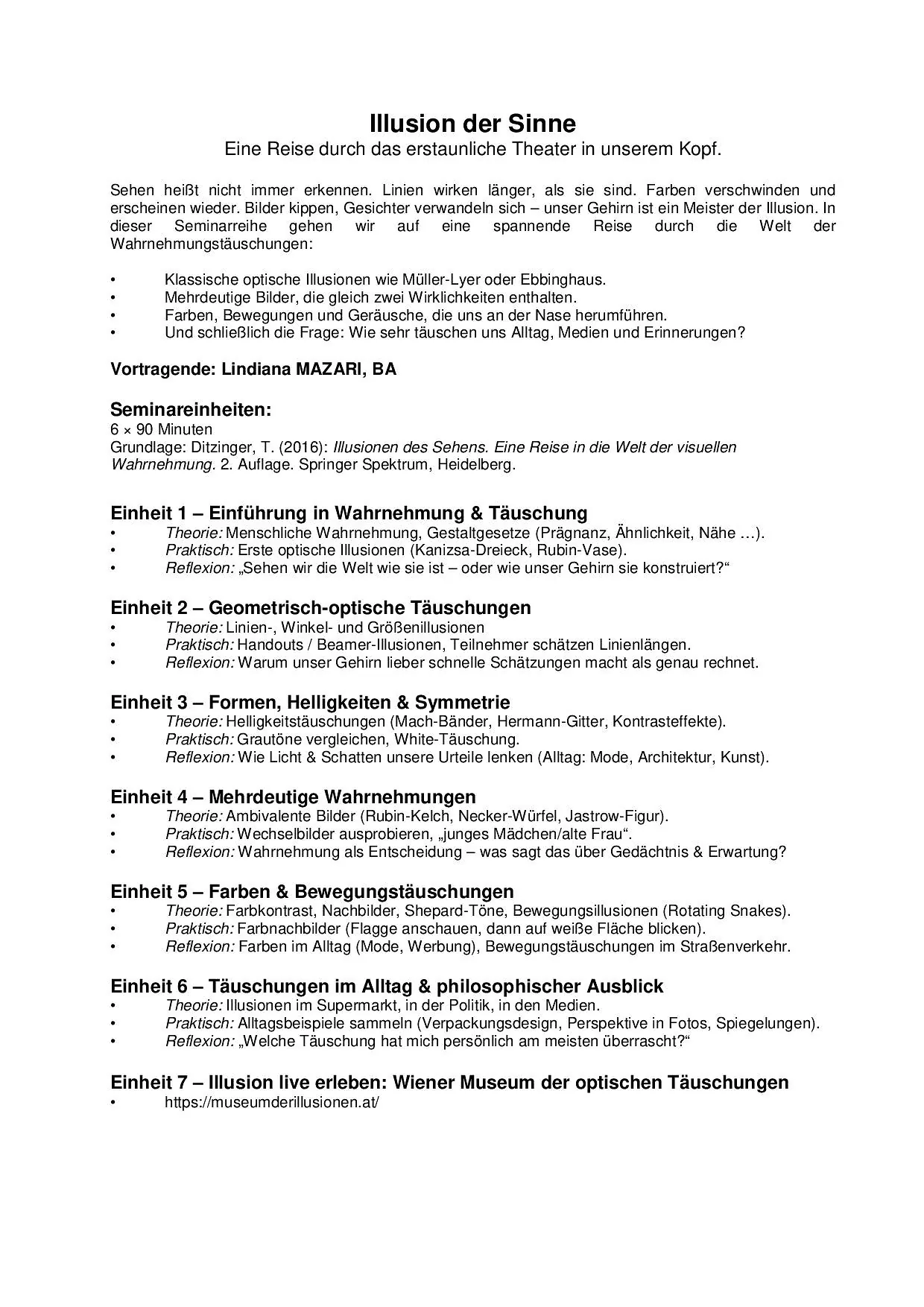 Illusion der Sinne Mo. 06.04.-18.05.2026 / 17:00h-18:30h / € 120,- bzw. 2x € 63,-